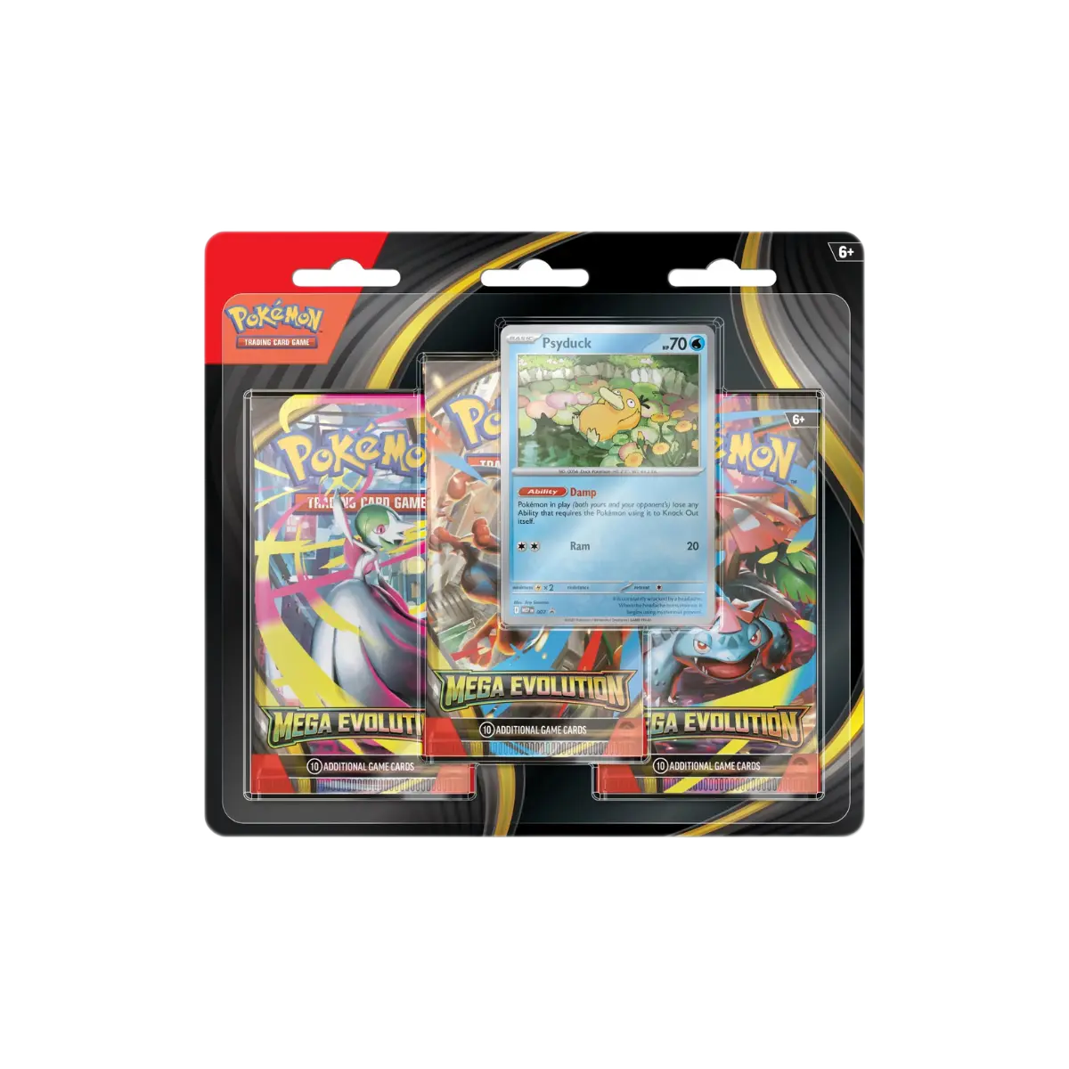 Each blister comes with 3 Mega Evolution booster packs and a promotional card of Psyduck/Golduck